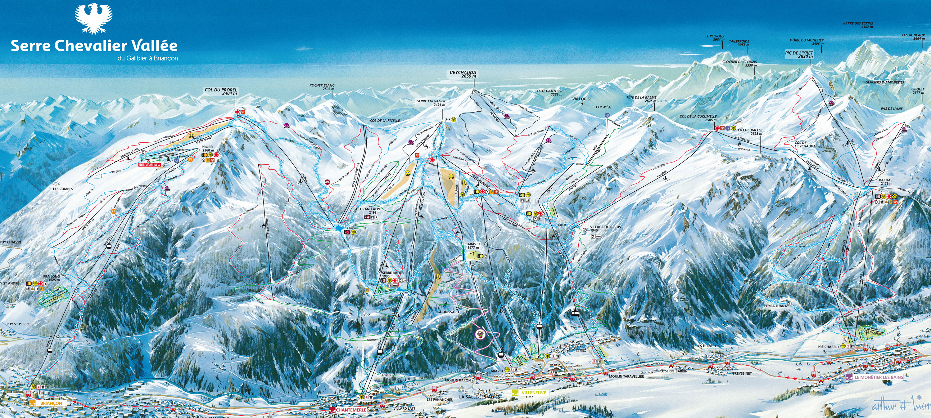Serre Chevalier se sitúa en los Alpes del sur. Se encuentra a las puertas del Parque Natural des Ecrins, culminado con una cima de 4.102m.